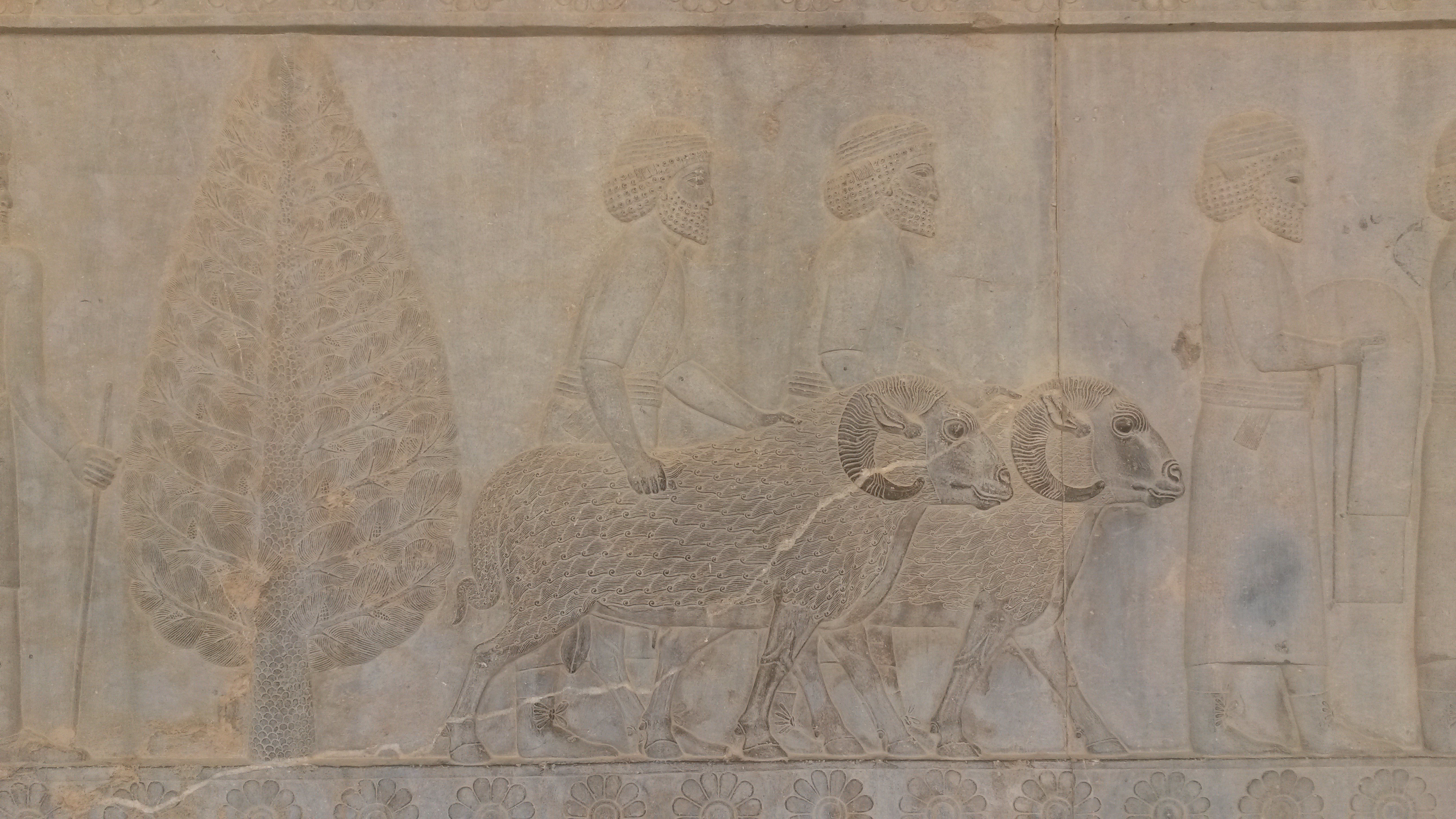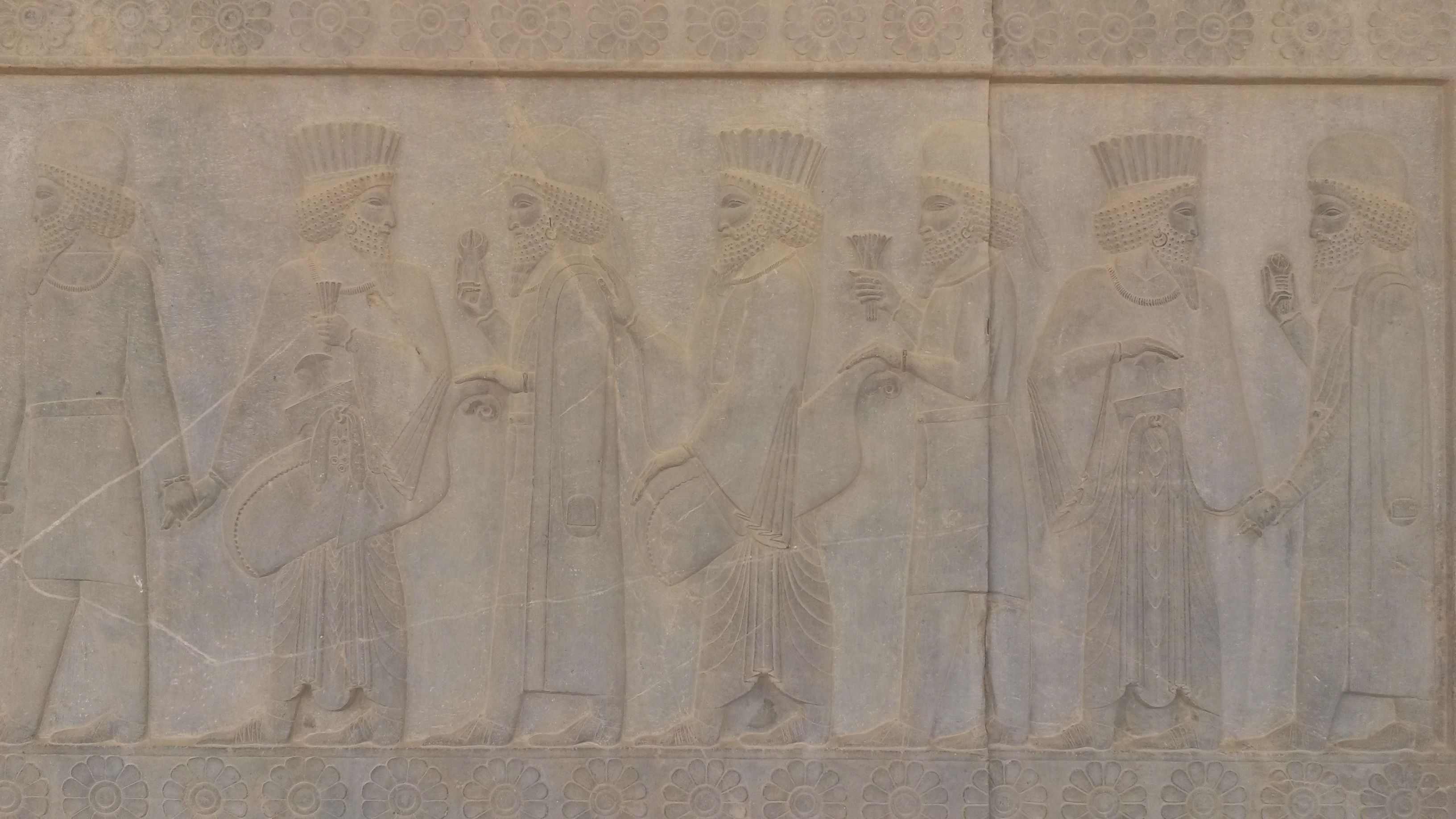 Mais surtout, un cortège de toutes les Nations défile vers Darius: 23 peuples avec leurs armes et leurs présents, menés chacun par un Perse ou par un Mède: Arméniens, Susiens avec une lionne, Lydiens, Babyloniens, Aryen avec une Peau de léopard, Cappadociens, Assyriens, Ioniens (Grecs d’Asie mineure), Egyptians, Bactriens avec un chameau, Parthes, Indiens, Arabes avec un dromadaire, Libyens avec une antilope, Éthiopiens avec des défenses d’éléphant…