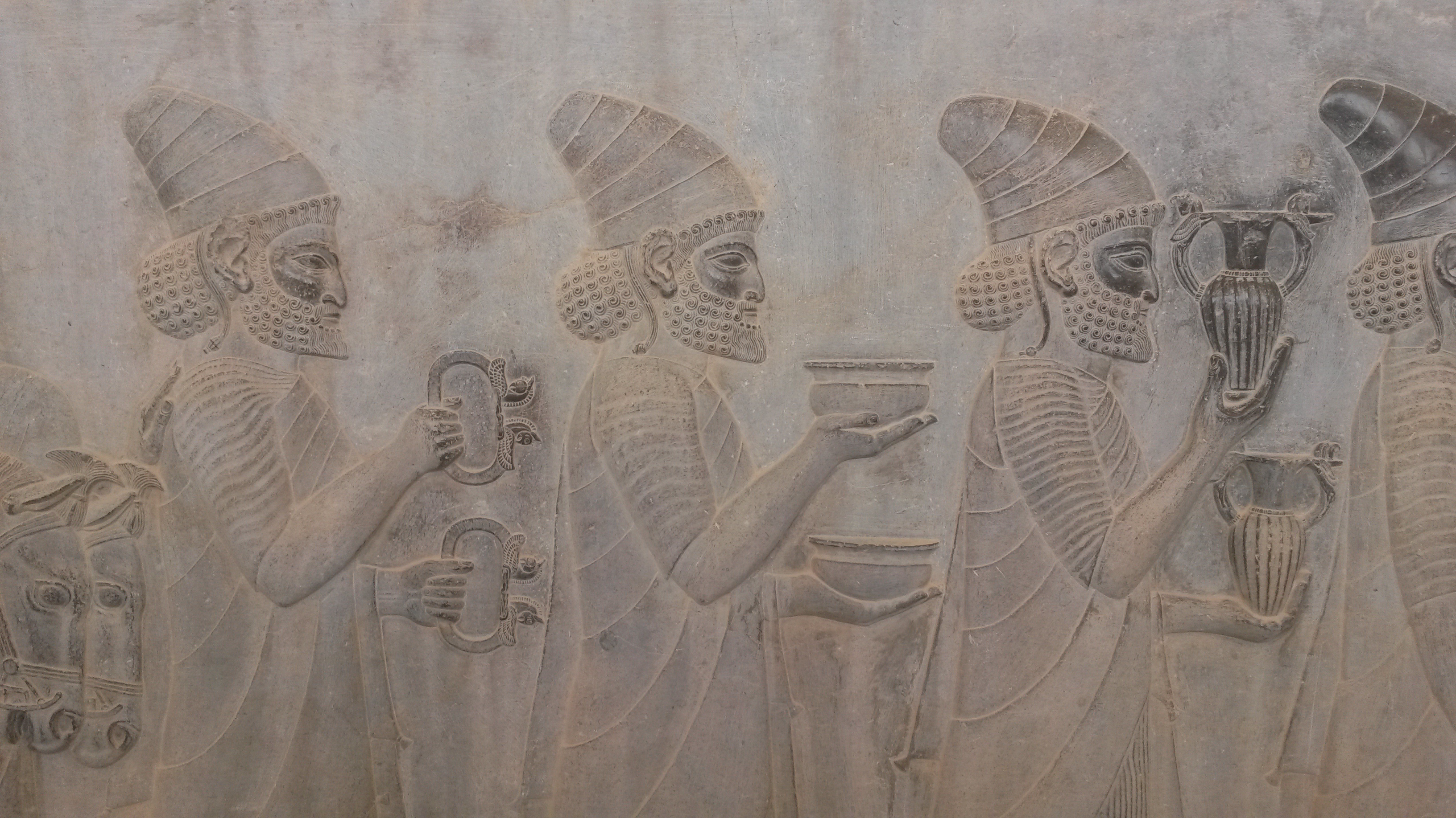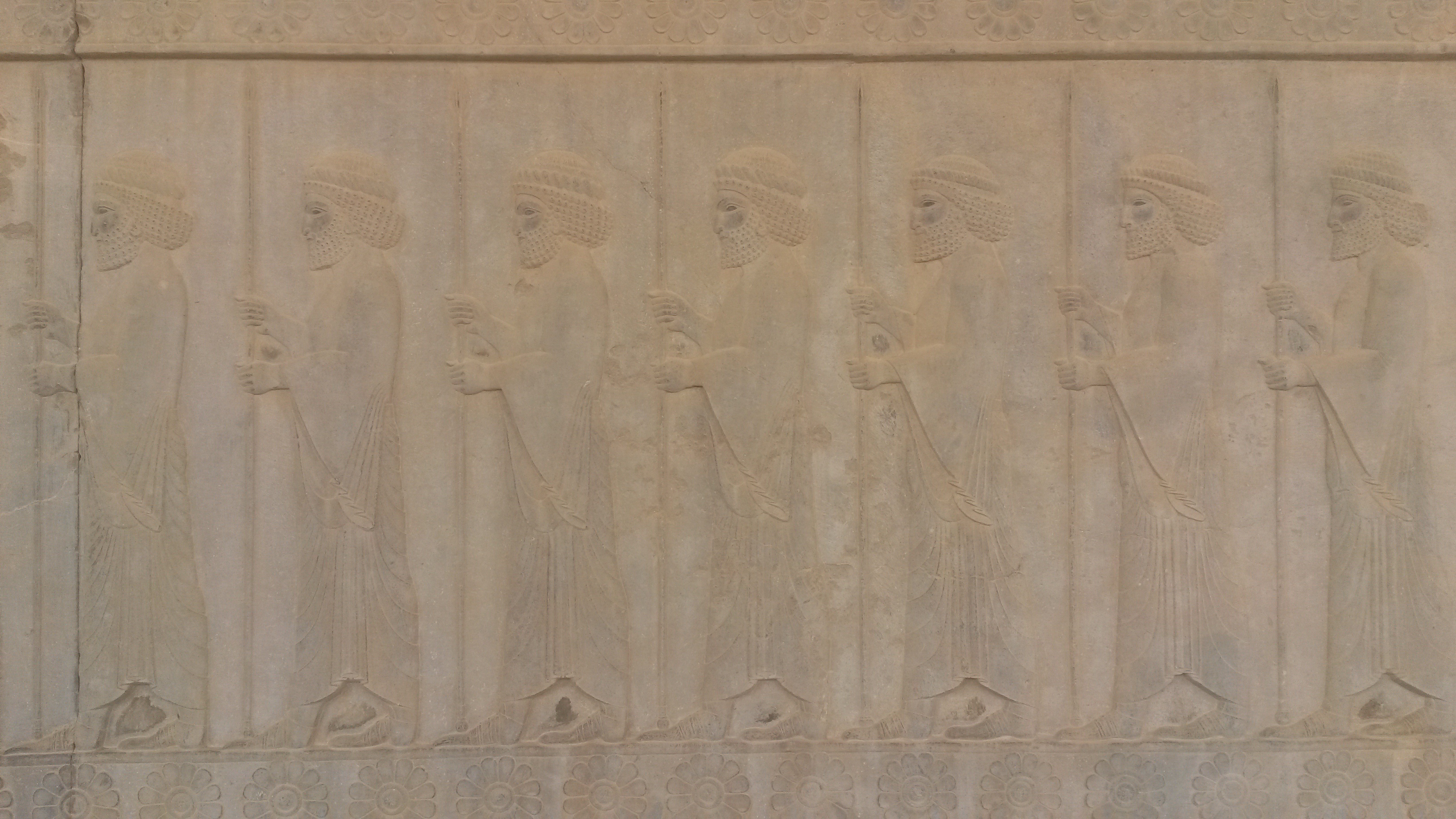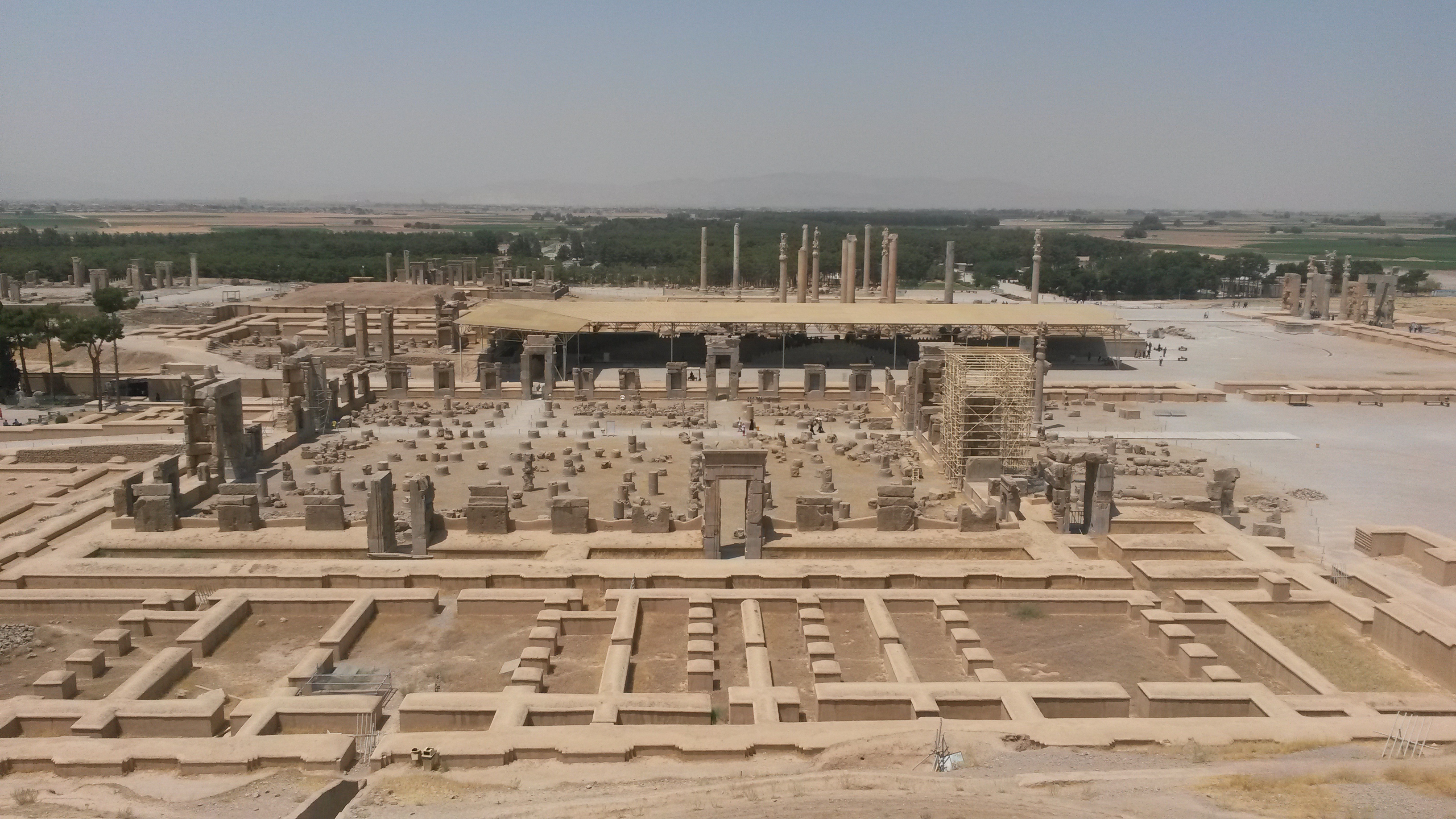 Depuis le tombeau d’Ataxerxès II, qui surplombe les palais, les dimensions du site paraissent colossales. Des palais il ne reste que quelques colonnes, des portes de passage, et la monumentale « Porte des Nations » par laquelle on accédait aux palais. L’imagination tente de relever les colonnes, de rebâtir les murs, de repeupler l’espace d’une foule de militaires, de dignitaires, de fonctionnaires…